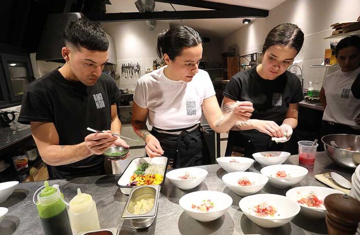 Cava Patagonica es atendida por Eduardo “Dudu” Schiebel, sommelier de Brasil, certificado por la WSET nivel 3, Master Sommelier Especialista en Vinos Valencianos por la DOP de Valencia, España. La vinoteca reúne etiquetas de los mejores vinos argentinos. Su pareja, Rhana “Jana” Silva Lima, también de Brasil, trabaja en Blanco es Negro como repostera y pastelera.